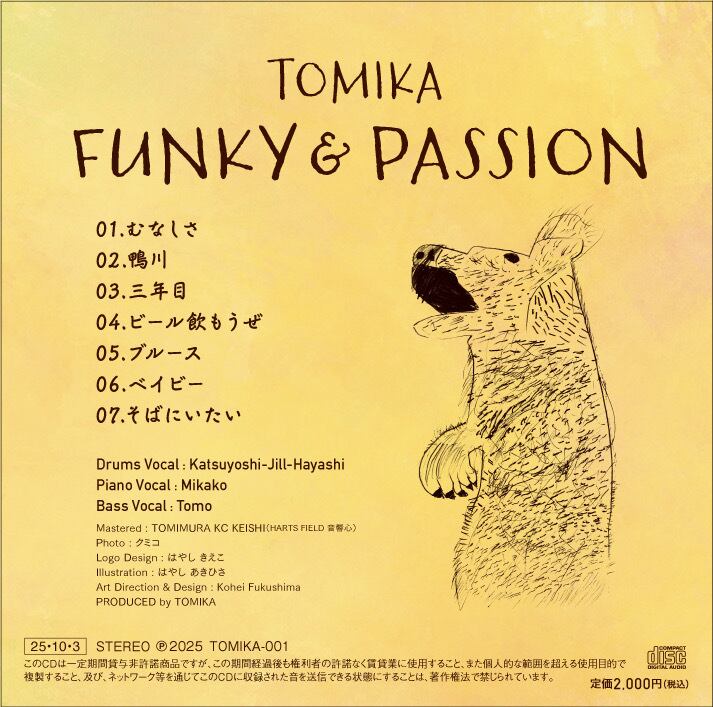 トミカの1stアルバム、「FUNKY&PASSION」がついに登場! ライブのラストに演奏されることが多い「そばにいたい」や、MVでも発表されている「むなしさ」含む全7曲!